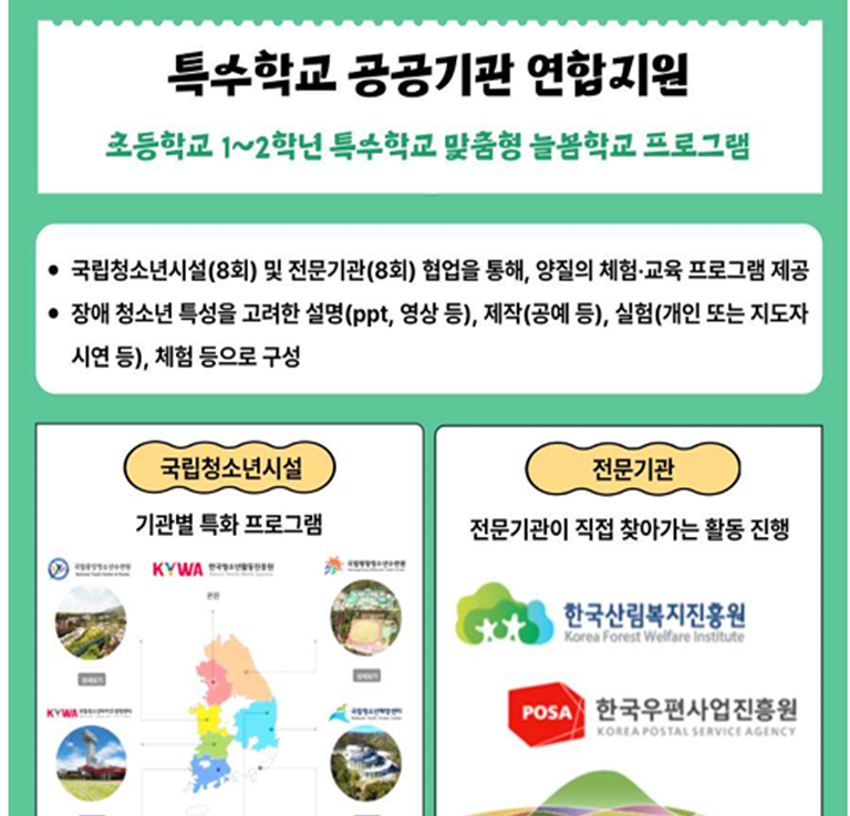 특히 2025년 초등학교 1~2학년 특수학교 대상 학생을 위한 ‘공공기관 연합지원’ 프로그램은, 국립청소년시설 및 전문기관이 각 8회씩 협업하여 다양한 체험 중심 활동을 제공합니다.