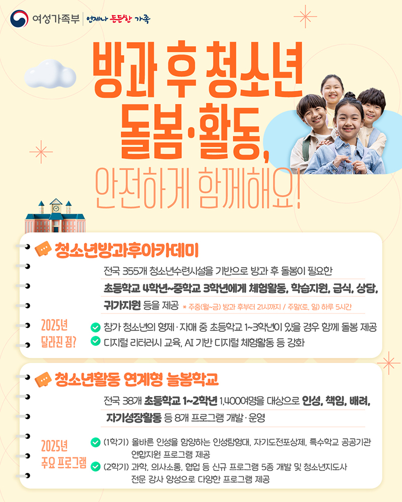 교육부와 여성가족부가 공동 추진하며, 전국 청소년수련관·문화의집, 청소년방과후아카데미 등이 함께해 지역-학교-청소년시설 간의 협업 체계가 강조됩니다.