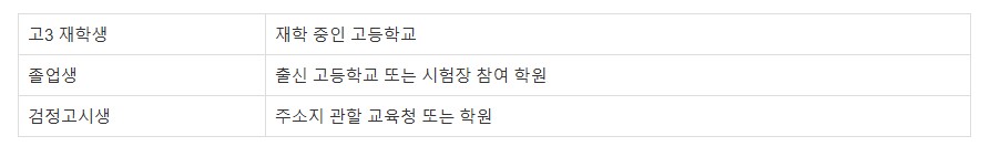 - 시험장 위치와 응시 대상자별 조건은 수능 공식 홈페이지에서 확인 가능