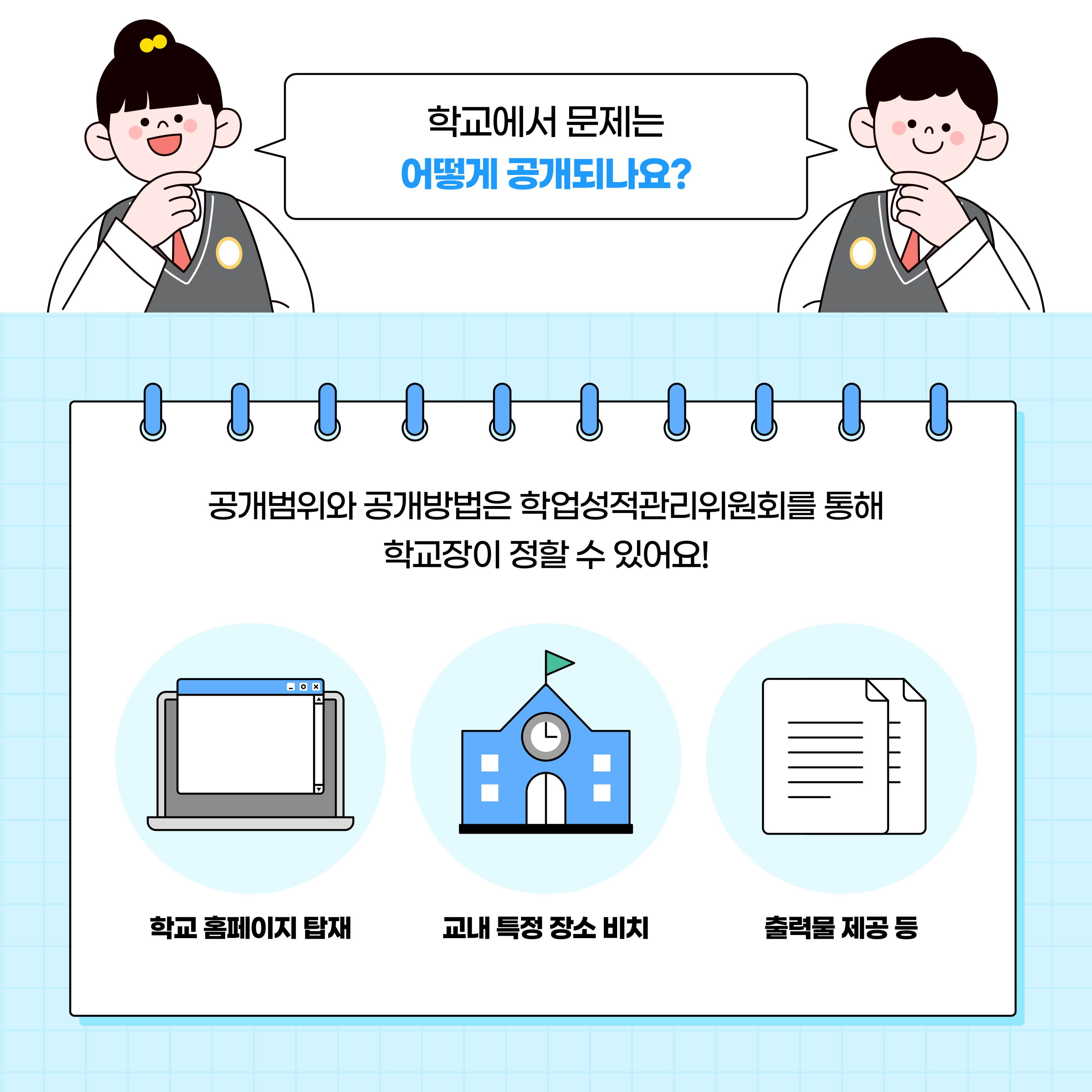 교육부 지침에 따르면, 학생 또는 학부모가 요청할 경우 학교는 기출문제를 열람할 수 있도록 안내해야 합니다.
