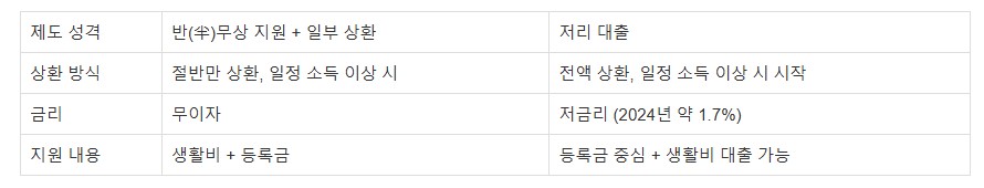 반면, 한국의 학자금대출은 교육부와 한국장학재단이 운영하는 '대출' 중심의 제도로, 등록금을 마련하기 위해 돈을 빌리고, 졸업 후 일정 소득이 발생하면 이를 상환해 나가는 방식이다. 생활비 대출도 가능하지만, 대부분은 등록금 부담이 핵심이다.
